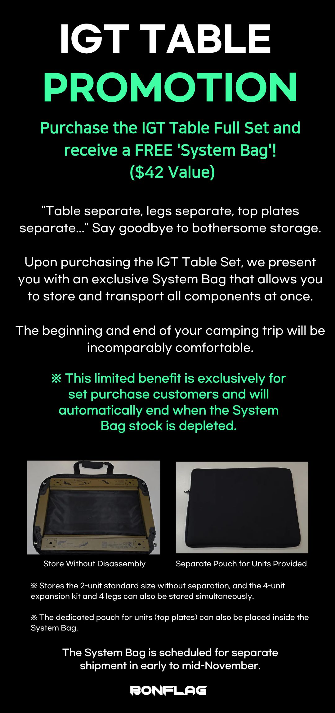 The core components of the IGT system—including the frame, units (One and Half), and legs—are encapsulated in a single, complete set.
